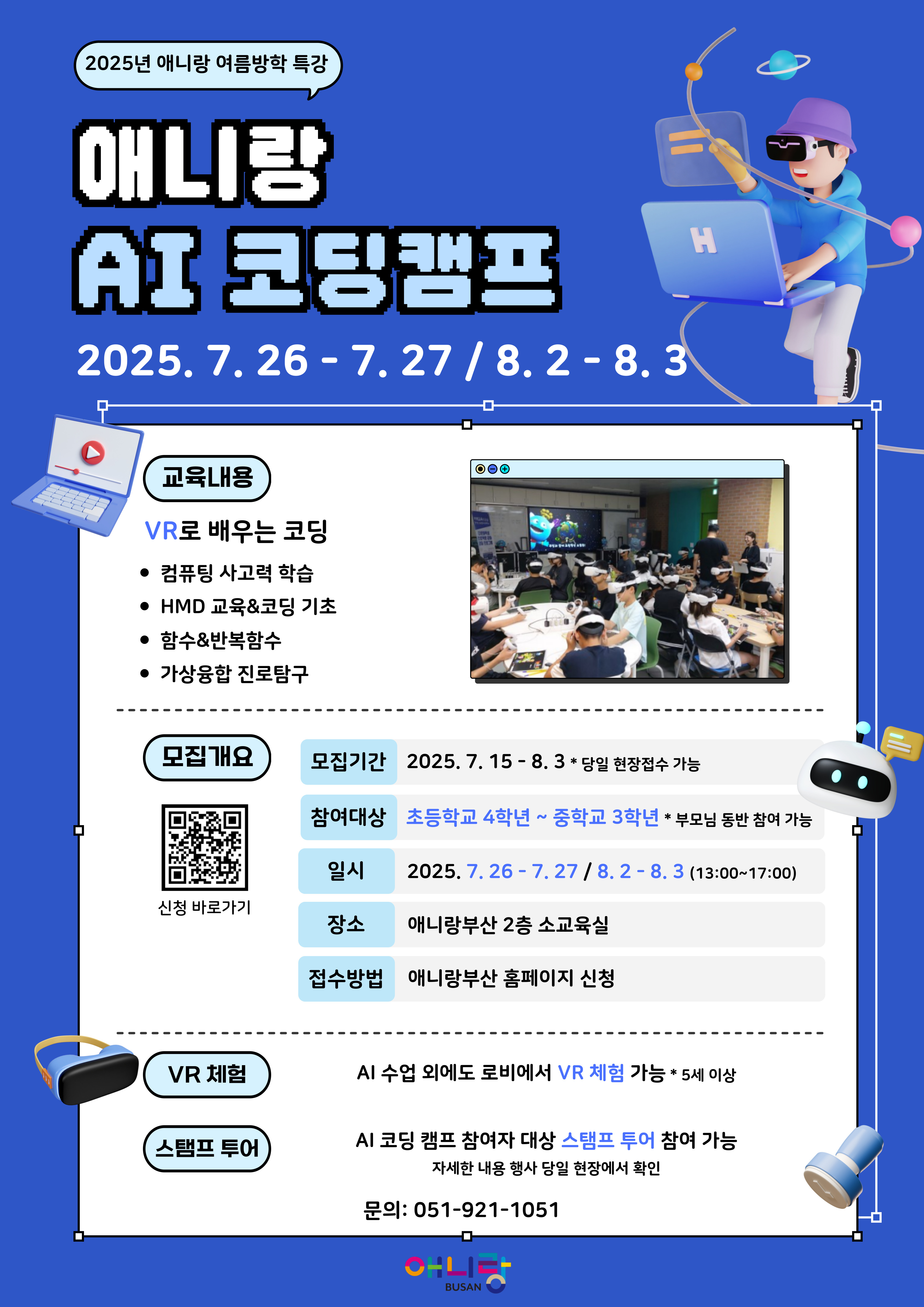 ❍ 신청방법 : 애니랑 홈페이지 로그인 - 알림마당- 교육안내 및 신청- 원하는 날짜 AI코딩 캠프 클릭 - 교육신청 - 신청서에 이름, 생년월일, 휴대폰 번호 꼭 작성하기!